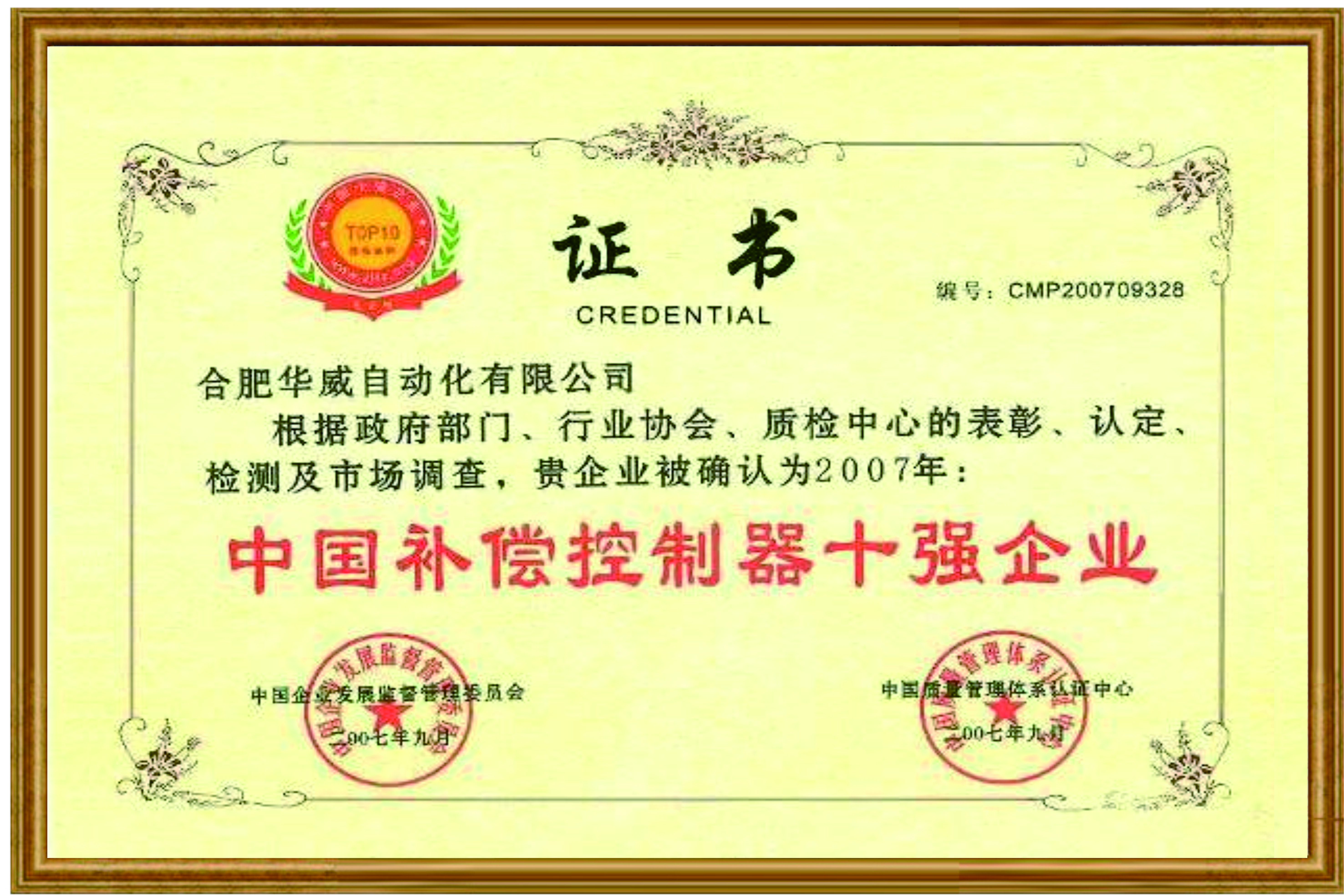 中國(guó)補(bǔ)償控制器十強(qiáng)企業(yè)證書